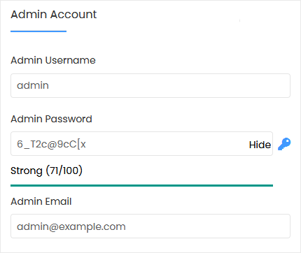 • Admin Username: Your new Microweber username (for security reasons, do not use the administrator or the admin username).